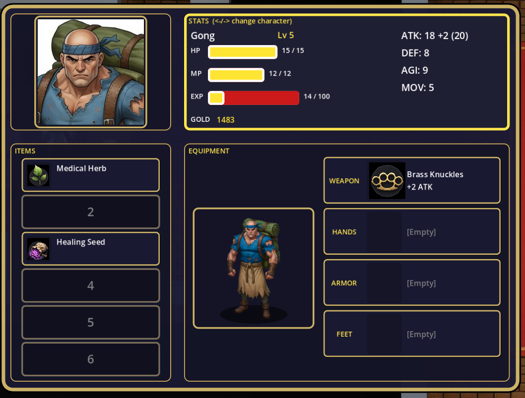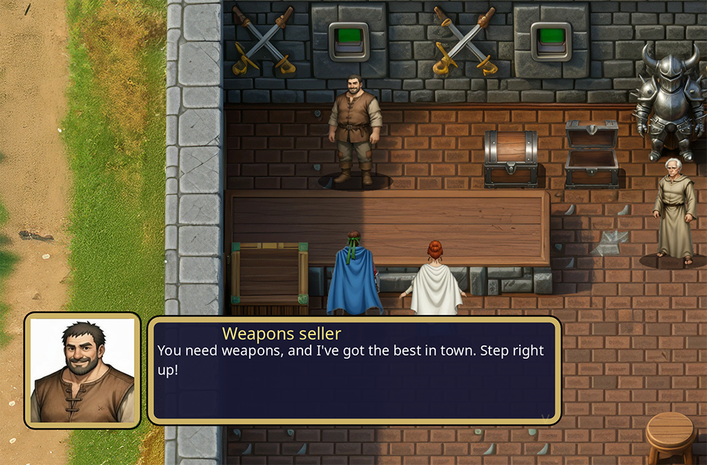 - Town Exploration — Walk around towns, talk to NPCs, recruit new party members (over 10 unique characters in this chapter one build), shop for weapons and items, and advance the story.